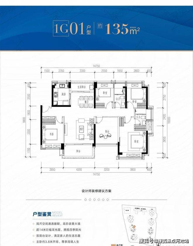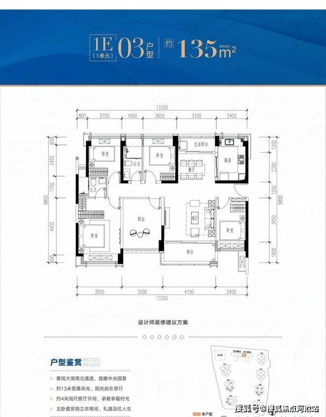 135平5房2卫,南北通透双阳台,东南朝向看花园,赠送面积21.51-21.8㎡,加赠送得房率约95.56-95.78%。