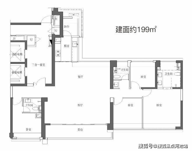 199㎡的4房2厅3卫,设计的是竖厅格局,2梯2户,专梯入户,独立入户玄关,LDKB一体化设计,客厅超大开间,四开间朝南,双主卧套间,客厅超大阳台看花园全貌景观,二字型厨房带1个生活阳台,公卫三段式分离,得房率约95%(包含赠送),正南朝向。