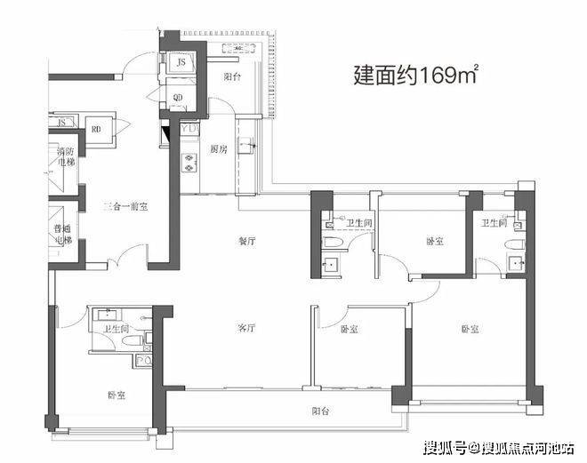 169㎡的4房2厅3卫,设计的是竖厅格局,2梯2户,专梯入户,独立入户玄关,LDKB一体化设计,四开间朝南,双主卧套间,客厅连接次卧出大阳台看花园全貌景观,二字型厨房带1个生活阳台,公卫三段式分离,得房率约95%(包含赠送),正南朝向。