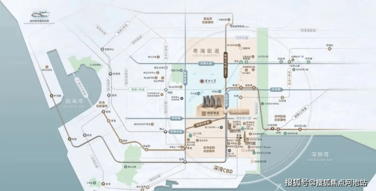 道路交通——四横三纵立体路网,四横有滨海大道、深南大道、北环大道、学府路;三纵有南海大道、后海大道、白石路出行,多主干道快速分流,畅达全城。项目直线距离蛇口码头约6.7公里,直线距离宝安国际机场也仅约15公里。