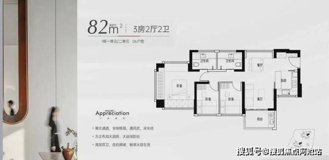 82㎡的3房2厅2卫,06户型,设计的是竖厅南北通透格局,进门独立玄关,LDKB一体化,主卧270°飘窗设计,U型厨房,卫生间干湿分离,得房率约98%(包含赠送),阳台主朝西北向。