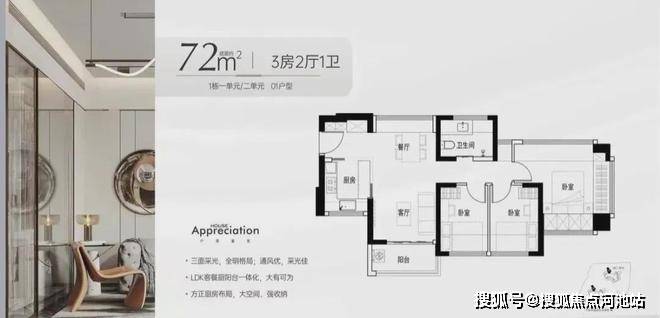 72㎡的3房2厅1卫,设计的是竖厅南北通透格局,进门独立玄关,LDKB一体化,主卧270°飘窗设计,L型厨房,卫生间干湿分离,得房率约100%(包含赠送),阳台主朝东北向。