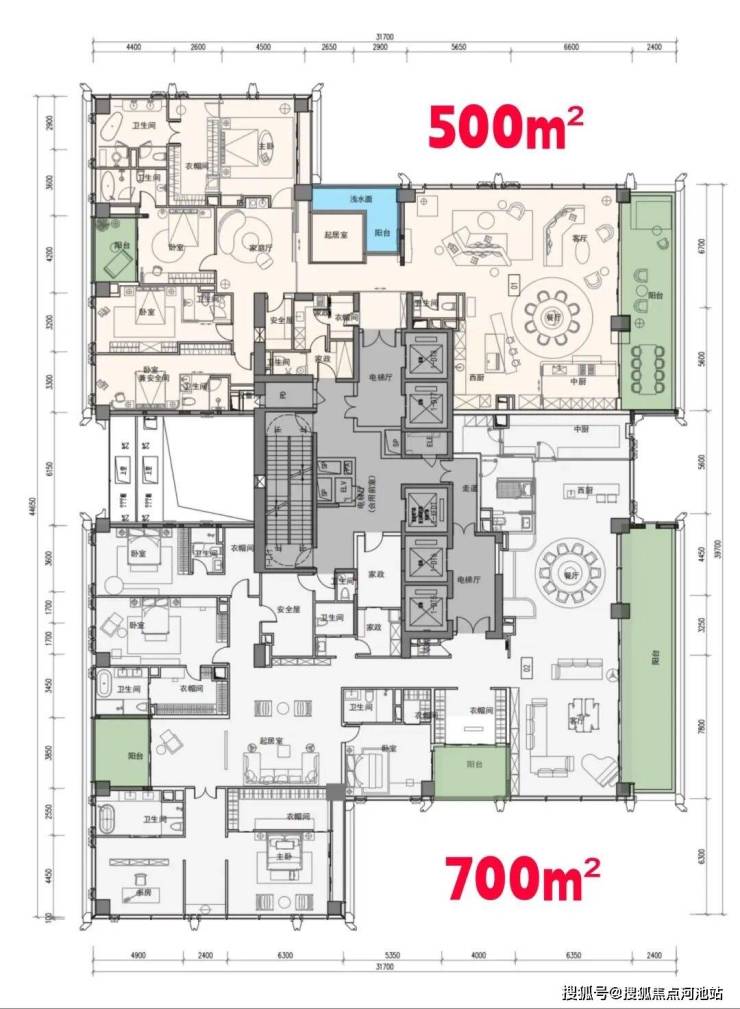 · 超高区58F起(200米以上)是约500-700㎡顶级大平层;