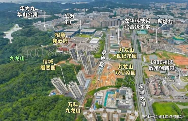 招商雍云府,位于深圳市龙华区福城街道九龙山社区龙澜大道旁,地处九龙山智能科技城核心区,规划范围9.81平方公里,是深圳市重点区域之一。项目紧邻华为新基地(直线距离约50米)和美团大湾区总部(约200米),处于龙华区福城街道与观澜街道交界处,西侧紧邻大水坑社区公园,北侧为九龙山风景区,生态资源丰富。