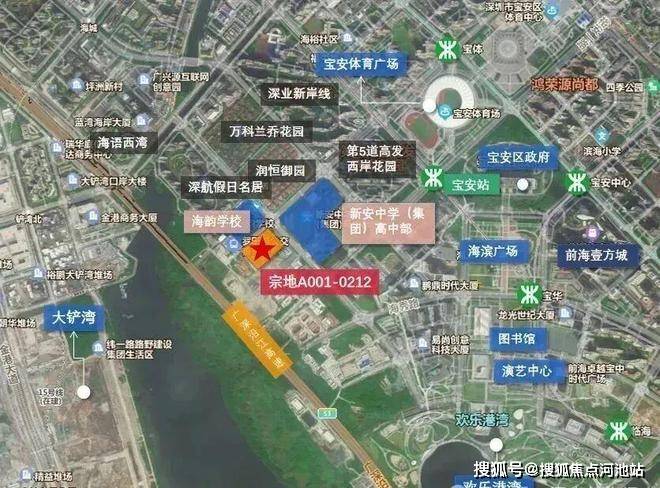 该地块位于宝中西侧,是宝中最后一个发展板块,具体位置在金科路与罗田路交汇处西南侧,北面是海韵学校、深航福利房深航假日名居,西面就是大铲湾,南面是湾区产业投资大厦,东面为新安中学(集团)高中部。