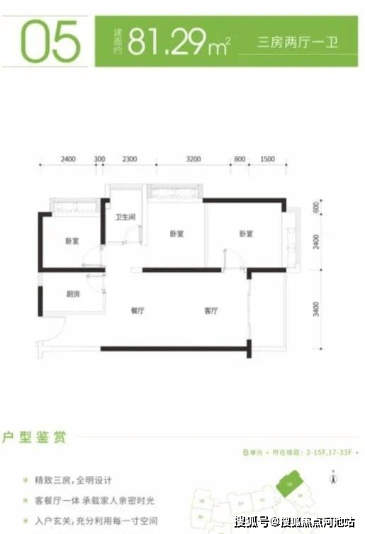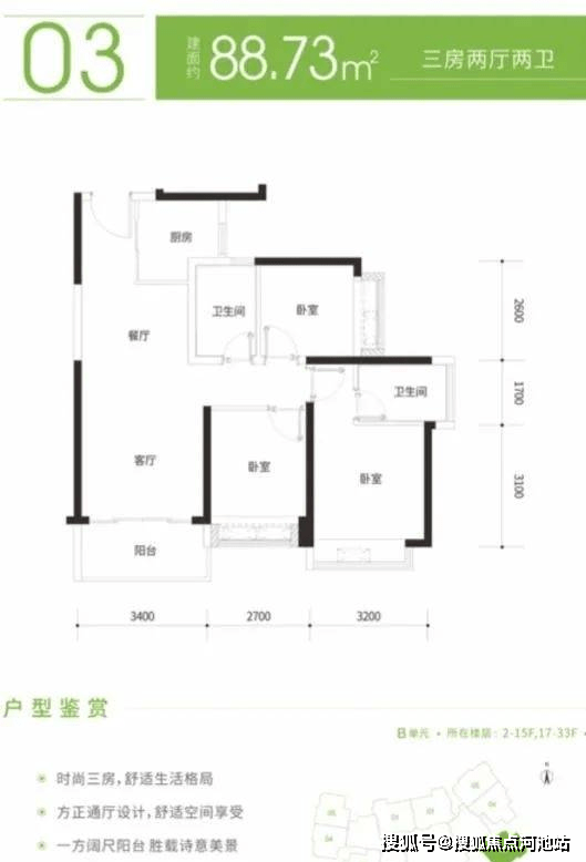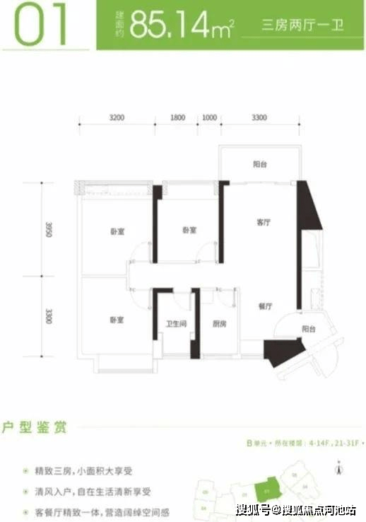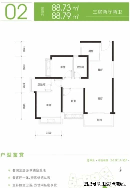 【建面85㎡3居】280万-分布于1栋 ,2梯5户,层高2.90米,总楼层33F。