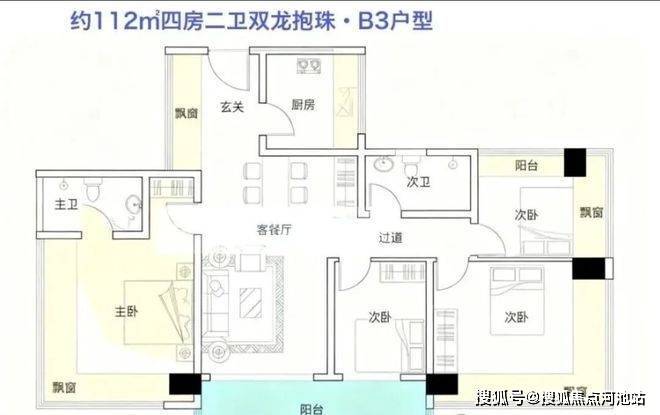 112㎡的4房2厅2卫(B3户型),设计的是竖厅双龙抱珠格局,进门独立入户玄关,餐客厅一体化设计,四开间朝南,全屋八面飘窗,主卧+1个次卧270°无柱转角飘窗,U型厨房,卫生间干湿分离,得房率约100%(包含赠送),客厅连接次卧出大阳台西南朝向。