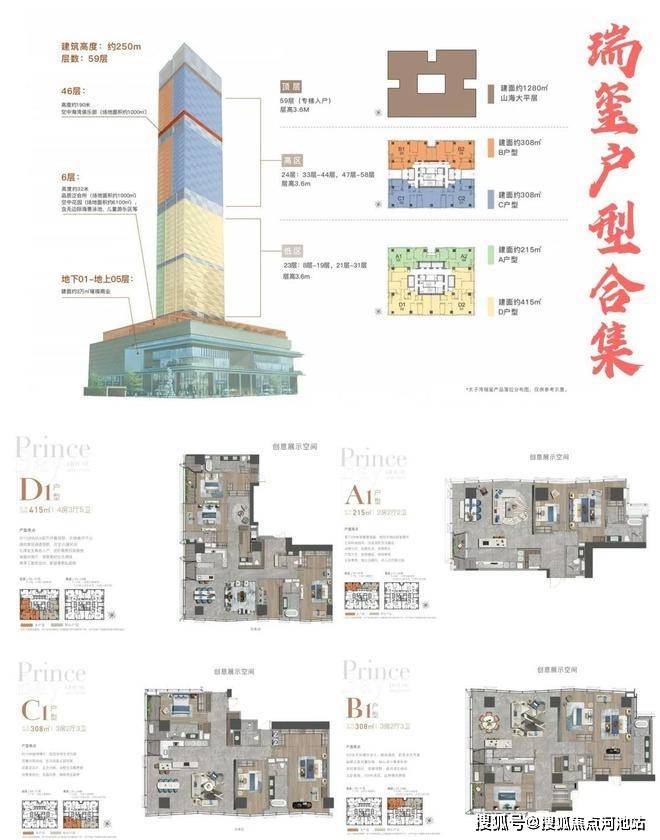 项目打造主力建面约215-415㎡纯粹品质公寓共191伙,位于顶层第59层为建面约1270㎡大平层鼎豪公寓产品。