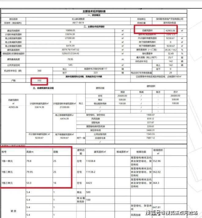 联发新澍雅居项目1栋1/2单元2梯6户,1栋3单元2梯4户设计,地下室有1层,规划360个车位,车位比1:1.08。