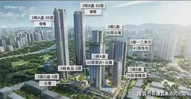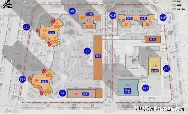 总栋数:8栋(1A栋42层酒店+公寓、1B栋28层保障房,2栋1/2单元41层住宅,3A/3B栋69层住宅;3C栋50层公寓、3D栋4层公寓)