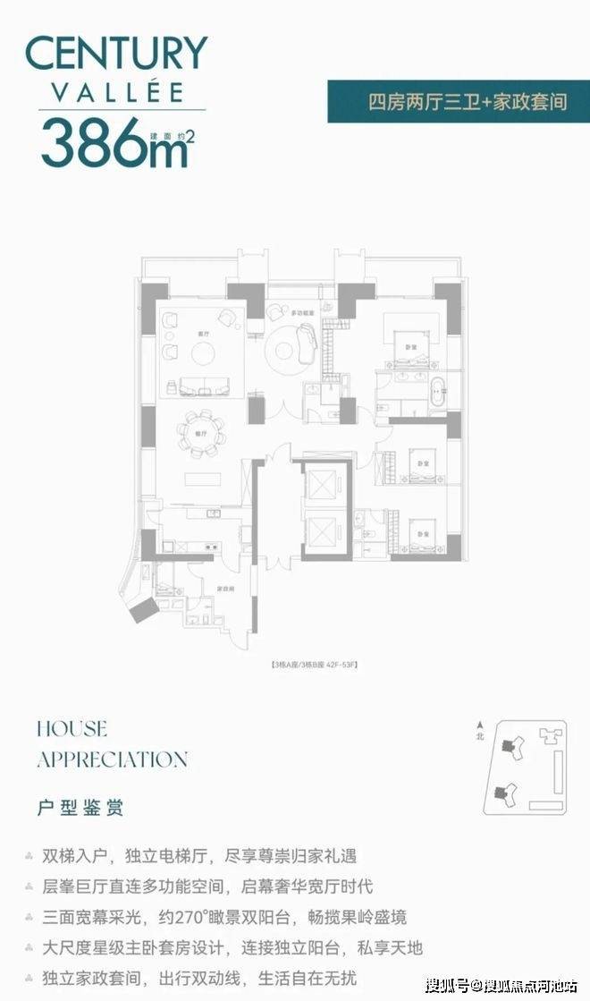 【约386㎡4+1房4卫】双梯入户,独立电梯厅,阔绰横厅直连多功能空间,三面舒适采光,主次卧双套房,270°环幕视野,还有独立家政套间,西朝向看名商高尔夫和大河沙生态长廊。