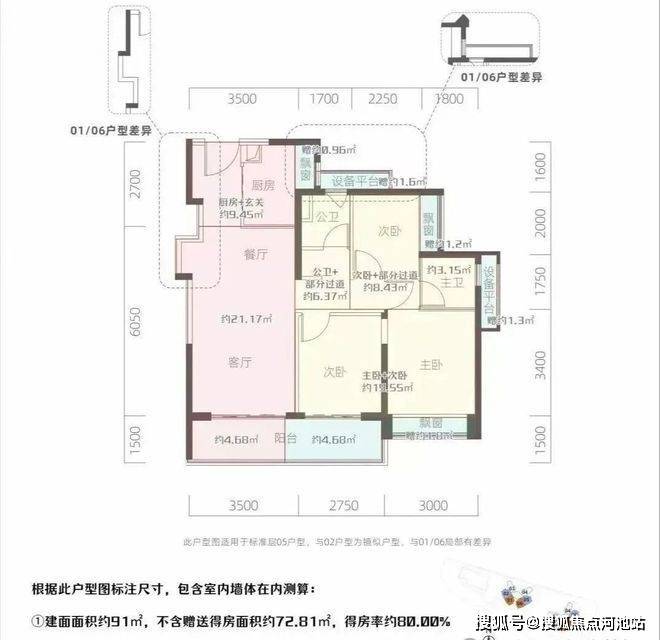 81㎡的3房2厅2卫,设计的是竖厅南北通透格局,客厅3.4米开间,3个卧室分别是3米/2.6米/2.2米的宽度,L型厨房,得房率:94.35%(包含赠送),阳台西北或东北朝向。