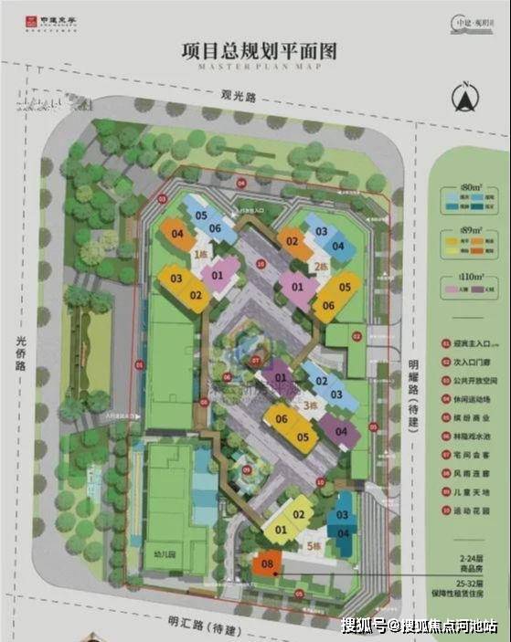项目共由4栋总高32-33F住宅组成,其中1/2/3栋商品房33F,5栋商品房+保障房32F,4栋是1所6班制幼儿园。
