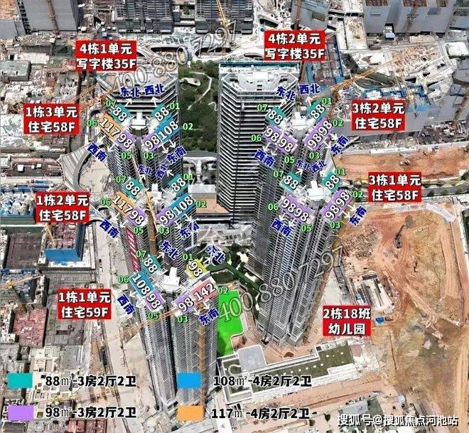 下面是鸿荣源观城项目楼栋和楼层、户型朝向航拍示意图: