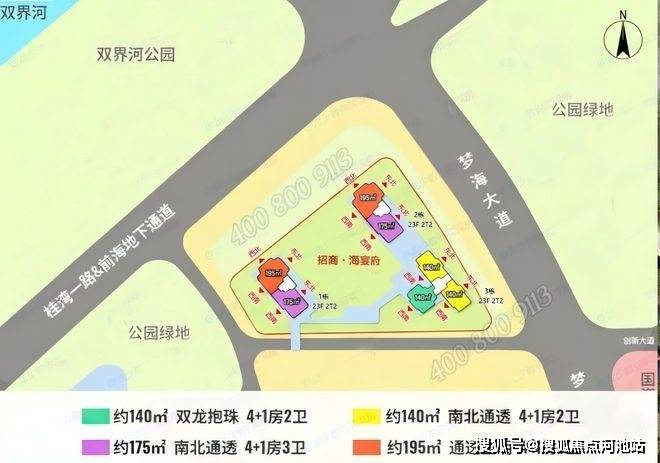 海晏府项目位于深圳前海桂湾最北端,紧邻双界河,占地约8287㎡,建3栋住宅,容积率仅3.1,限高80米,是前海近年少有的低密度社区。共151套房源,均为建面约139㎡起跳的四房及以上大户型,车位254个,无保障房配建、无7090限制、无售价限制,定位纯粹高端改善。