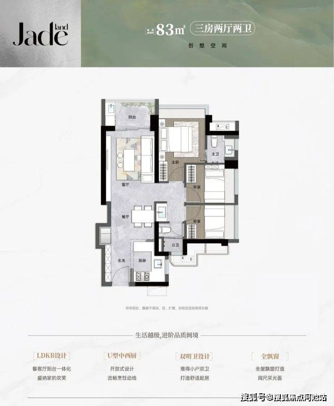 83㎡的3房2厅1.5卫,设计的是竖厅格局,进门入户玄关,LDKB一体化,S墙设计预留冰箱卡槽位,U型厨房,主卫少了淋浴,公卫三段式分离,得房率约92%(包含赠送),阳台西北朝向。