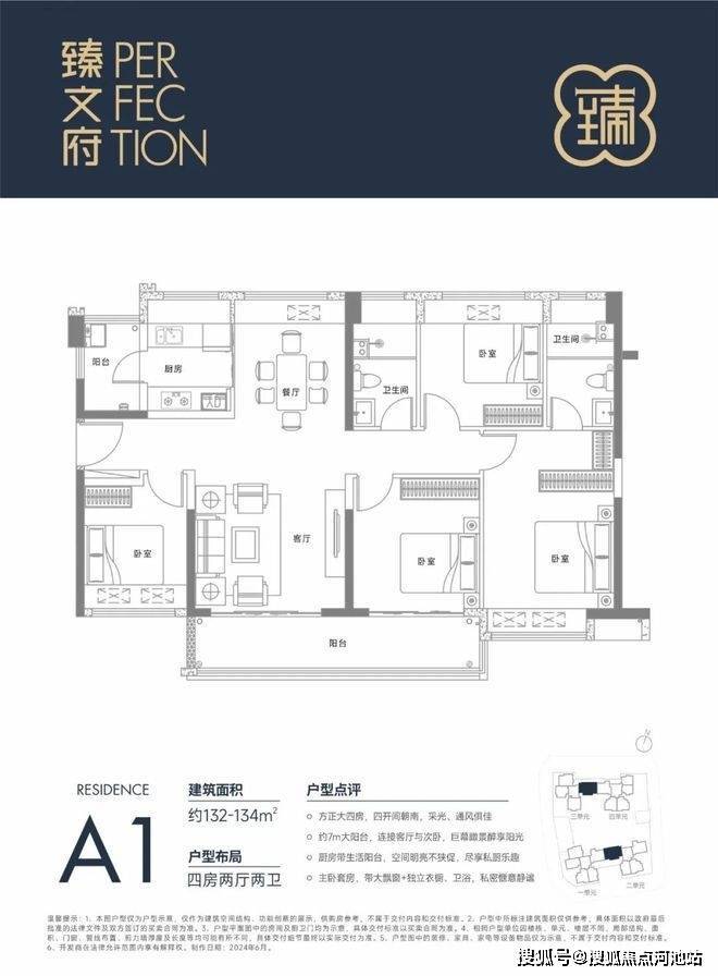 132㎡的4房2厅2卫,设计的是竖厅南北通透格局,客厅4米开间,一体化客餐厅,四开间朝南,全屋飘窗,客厅连接次卧出7米长的大阳台,主卧大套房设计,二字型厨房还带1个小生活阳台,卫生间干湿分离,得房率约85%(包含赠送),阳台主朝东南向。
