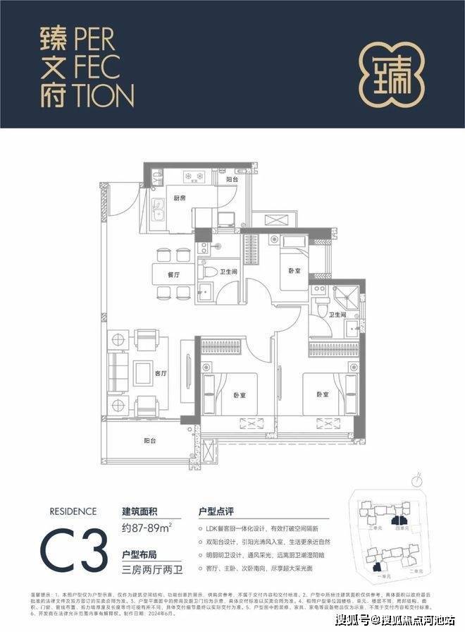 87㎡的3房2厅2卫,设计的是经典竖厅格局,进门入户玄关,LDKB一体化设计,三开间朝南,L型厨房还带1个小生活阳台,卫生间干湿分离,得房率约85%(包含赠送),阳台朝东南向。