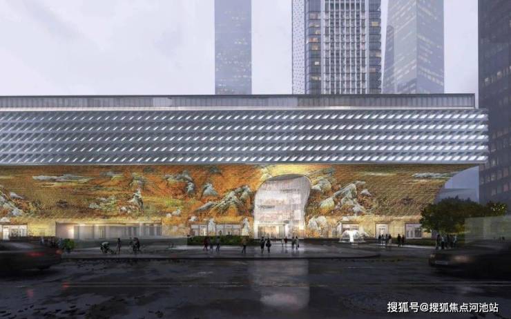 太子湾泓玺项目将裙房5楼6楼向北外挑20米,与首层地面开放的景观轴上下形成一体的城市开放客厅,沿悬挑平台到二层位置设计成200M超长弧形巨幕,平时作为城市客厅的投影剧院,形成20米超大悬挑+200米宽开放的室外投影剧幕。