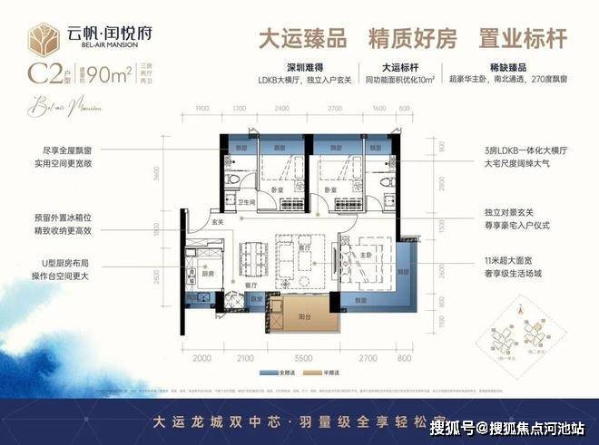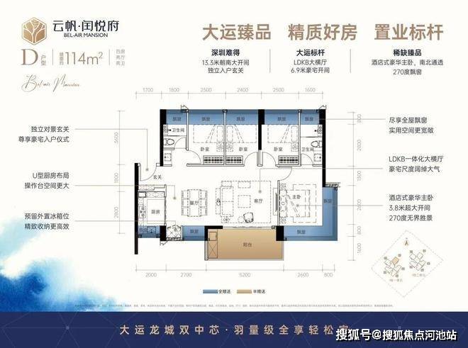 横厅格局,LDKB一体化,进门入户玄关,客厅带3.5米阳台,U型厨房,主卧南北通透270度景观,卫生间干湿分离。