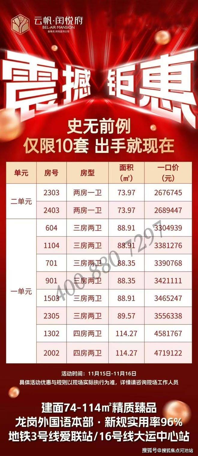 最新消息:深圳龙岗中心城新楼盘——云帆闰悦府,项目已于2025年10月11日取证入市,本次开盘推出1栋1/2单元,共147套房源,面积有74m²的2房1卫,89m²的3房2卫,114m²的4房2卫户型,朝向都非常好,都是东南、西南要么南北通透的格局,备案均价4.82万/m²,备案单价4.55-5.34万/m²,总价345-610万/套,合同约定在2027年6月份带精装交付,配置了格力中央空调+方太厨电三件套(洗碗机+煤气灶+抽油烟机)+科勒卫浴+王力钢木装甲门+智能门锁。