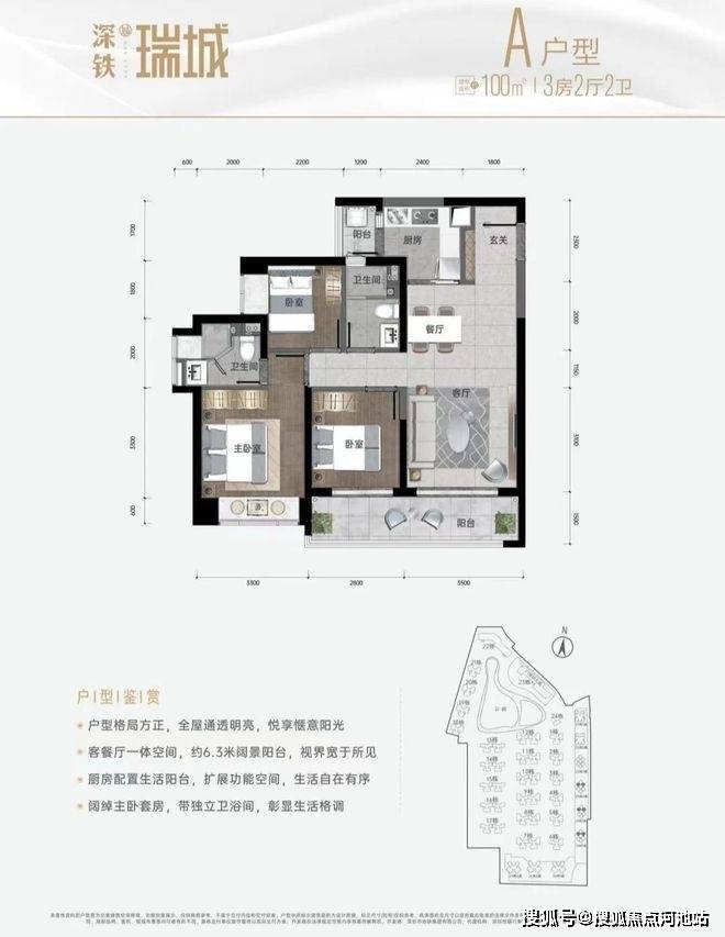 深铁瑞城,总占地面积约18.9万㎡,总建筑面积约64万㎡,计容建筑面积约57.7万㎡,容积率3.06,绿化率25%,项目共分3期开发,总规划4770户(其中商品房2770套,人才房606套,保障房1394套),停车位3202个(占比1:0.67)。