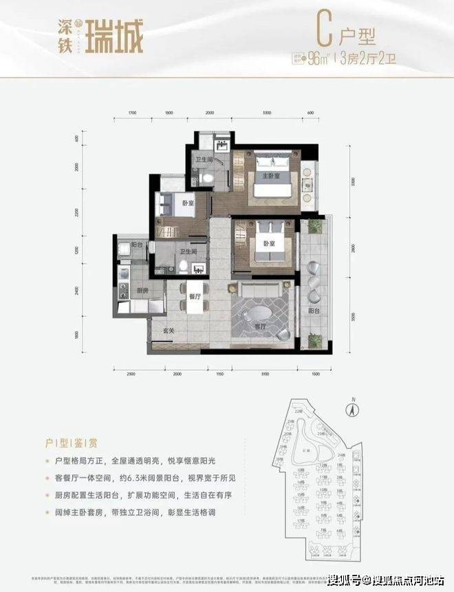 96㎡的3房2厅2卫,C户型,设计的是经典竖厅格局,进门入户玄关,客厅3.5米开间,LDKB一体化设计,动静分区,3个卧室分别做到了主卧12.49㎡/次卧7.3㎡/次卧6.05㎡(实测面积,去掉墙体),客厅连接次卧出6.3米长的阳台,L型厨房还带1个生活阳台,卫生间干湿分离,得房率约:75.76%(不含赠送),东南朝向。