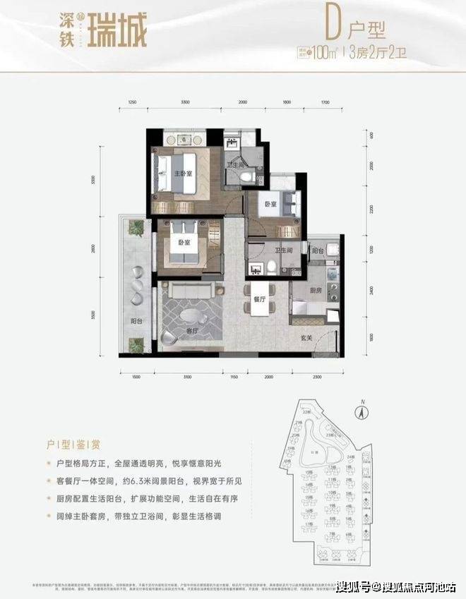 100㎡的3房2厅2卫,D户型,设计的是经典竖厅格局,进门入户玄关,客厅3.5米开间,LDKB一体化设计,动静分区,3个卧室分别做到了主卧12.24㎡/次卧7.54㎡/次卧6.06㎡(实测面积,去掉墙体),客厅连接次卧出6.3米长的阳台,L型厨房还带1个生活阳台,卫生间干湿分离,得房率约:75.76%(不含赠送),西北朝向。
