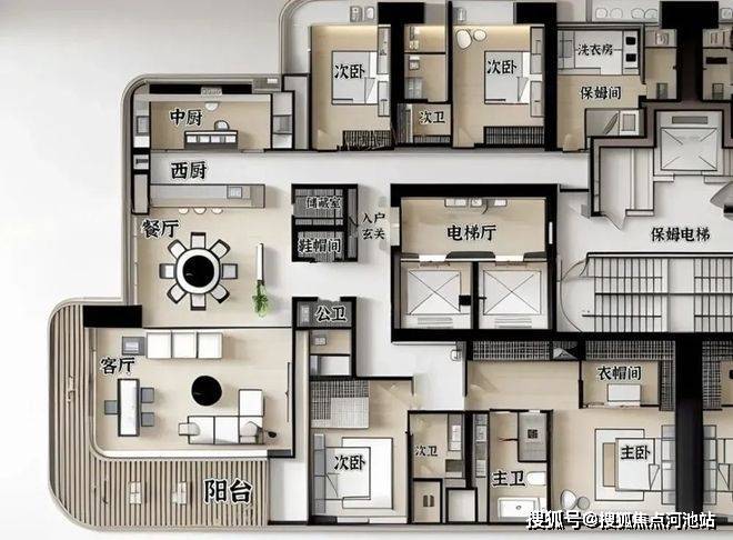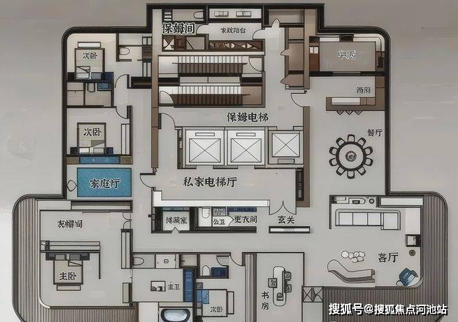 -510㎡一层一户顶豪:3梯1户的专属配置,层高3.6米,5+1房3厅5卫的阔绰格局,搭配165.77米的地标高度(43层),将"私密性"与"仪式感"拉至顶点。这种"一户独占整层"的设计,不仅是空间的奢侈,更是圈层纯粹性的象征。