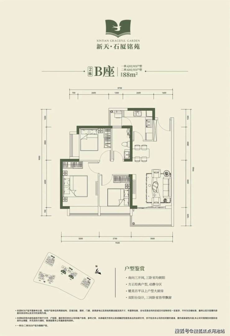 2栋B座一单元02、03户型、2栋B座二单元02、03户型:面积约为88㎡的3房2厅1卫;