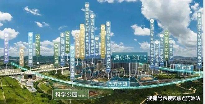满京华金硕悦府,位于深圳光明区光明科学城“一心两区”的核心区域,紧邻占地208万平方米的科学公园,属于光明规划中“最宜居、居住板块最大”的片区。项目北侧与科学公园仅一街之隔,东、南侧为深圳小学光明学校狮山校区及初中校区,周边市政配套规划密集,如深圳科技馆新馆、国际美术馆等均在建设中,预计2026年前全面落成。