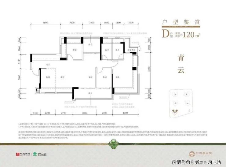 竖厅格局,进门入户玄关,客厅3.5米开间,S墙预留冰箱位,四开间朝南,4个卧室分别做到了主卧17.98㎡/次卧8.37㎡/次卧8.1㎡/次卧7.75㎡(含飘窗),公卫干湿分离,带1个约2㎡的设备平台,得房率约81%(不含赠送),客厅连接次卧出9.6㎡的观景大阳台,东南或西南朝向。加上赠送后得房率约104.16%。