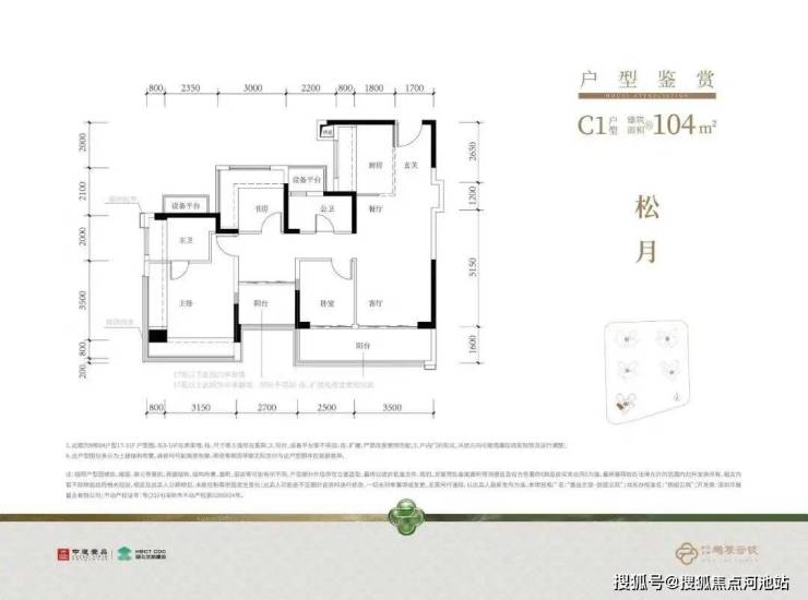 竖厅格局,进门入户玄关,客厅3.5米开间,S墙预留冰箱位,四开间朝南,4个卧室分别做到了主卧17.98㎡/次卧8.37㎡/次卧8.1㎡/次卧7.75㎡(含飘窗),公卫干湿分离,带1个约2㎡的设备平台,得房率约81%(不含赠送),客厅连接次出9.6㎡的观景大阳台,东南或西南朝向。加上赠送后得房率约104.16%。