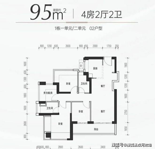 95㎡的4房2厅2卫,设计的是竖厅格局,进门独立玄关,LDKB一体化,S墙设计预留冰箱卡槽位,主卧双飘窗设计,客厅连接次卧出6米长的大阳台,L型厨房,卫生间干湿分离,得房率约97%(包含赠送),西南朝向。