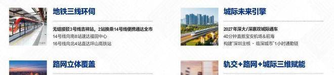 轨道交通:已运营的3号线吉祥站距离约300米,2站抵达大运枢纽,可换乘14号线与16号线,6站到罗湖,7站到福田;在建深大城际设站大运,2站至五和,5站到石岩;深惠城际设站龙城公园,4站至深圳北站,5站抵南山