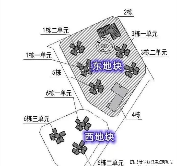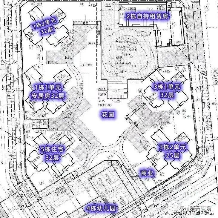 东地块有6栋住宅,1栋1单元安居房30F,1栋2单元商品房32F,2栋企业自持租赁住房32F,3栋1单元商品房32F,3栋2单元商品房25F,4栋是1所12班制幼儿园。