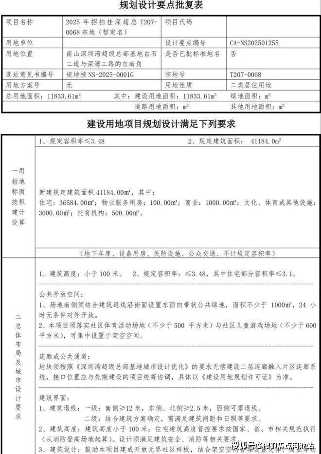 本项目地块T207-0068位于南山深圳湾超级总部基地白石二道与深湾二路的东南侧,土地面积11833.61㎡,建筑面积41184㎡,规定容积率3.48,其中住宅容积率3.1,起始价223600万元。新建定建筑面411184㎡,其中住宅36584㎡,物业服务用房100㎡,商业1000㎡,文化、体育或其他设施3000㎡,托育机构500㎡,建筑高度小于100米。