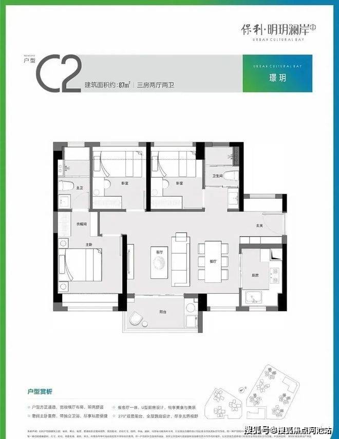 87㎡的3房2厅2卫,设计的是横厅南北通透格局,客餐厅实测5.2米开间,进门独户玄关,主卧大套间,U型厨房,公卫三段式分离设计,得房率:77.57%(不含赠送),阳台主朝西南或东南朝向。
