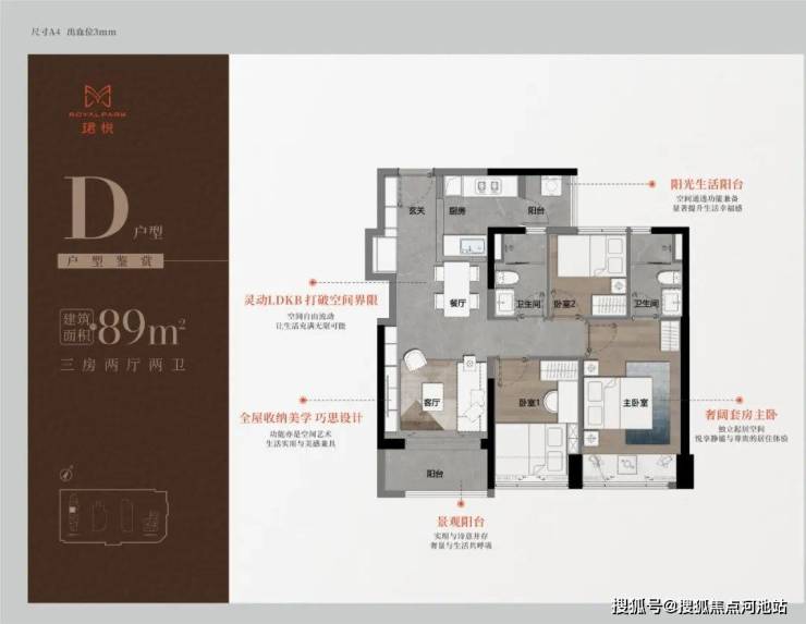 89㎡的3房2厅2卫,D户型(2栋1单元03户型),设计的是经典竖厅格局,进门入户玄关,LDKB一体化,S墙设计预留冰箱卡槽位,三开间朝南,动静分区,二字型厨房还带1个生活阳台,卫生间干湿,西南朝向,靓点是最小的次卧没有飘窗,跟C户型基本一致