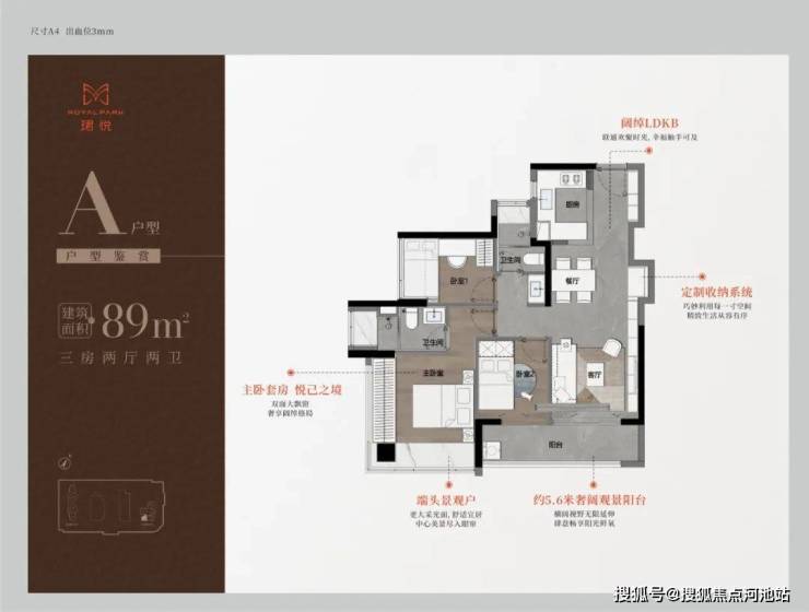 89㎡的3房2厅2卫,A户型(1栋1单元06户型),设计的是经典竖厅格局,进门入户玄关,LDKB一体化,S墙设计预留冰箱卡槽位,三开间朝南,动静分区,主卧双面大飘窗,客厅连接次卧出5.6米长的观景阳台,U型厨房,公卫三段式分离,东南朝向。