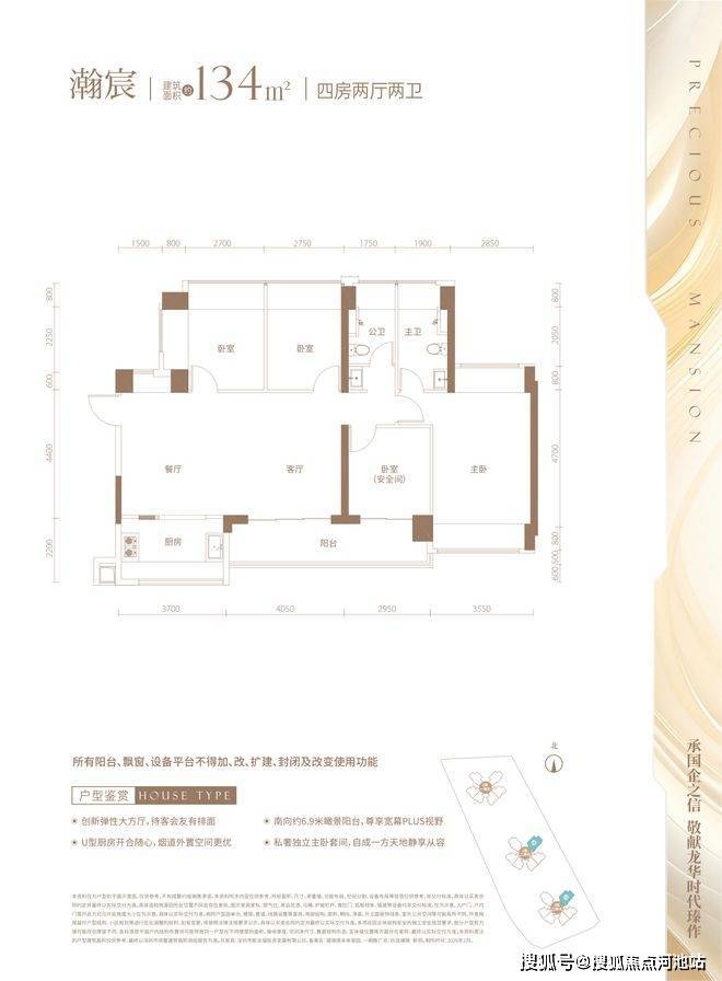 非常出众的四房横厅户型,此前多见于南山和前海的千万级新房。这种设计同样做到了四面采光和四开间朝南,比较受年轻群体的喜爱。