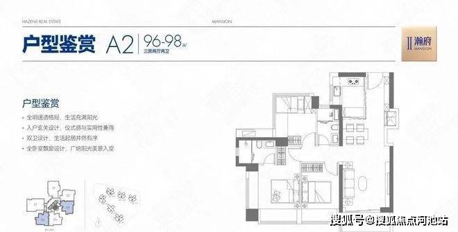 96-98㎡的3房2厅2卫,A2户型/2栋2单元03/06,设计的是经典竖厅格局,客厅3.5米开间,LDKB一体化,S墙设计预留冰箱卡槽位,动静分区,三开间朝南,主卧+1个次卧双飘窗,得房率约78%(不含赠送),U型厨房,卫生间干湿分离,西南或东南朝向。