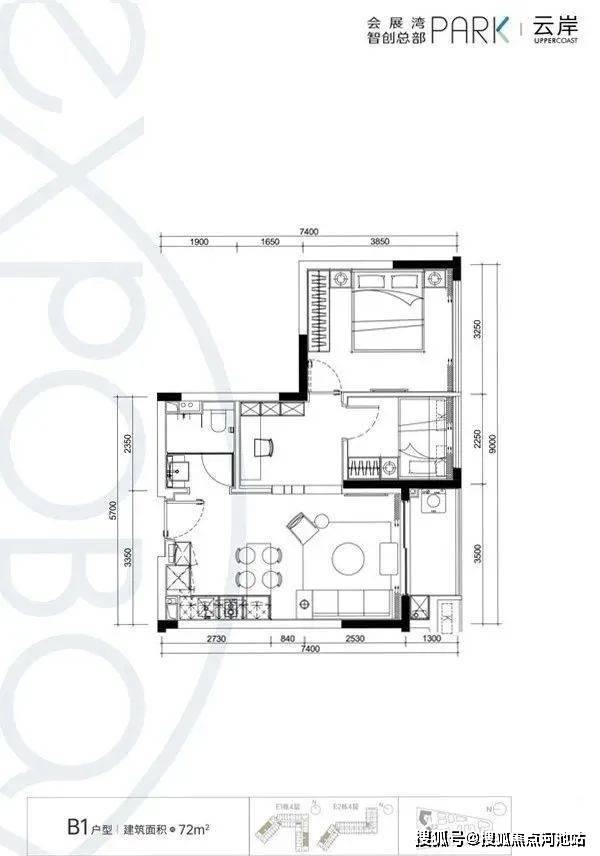 【B1户型:72㎡】房型:2+1房一厅一卫朝向:E1、E2(西北、东南)