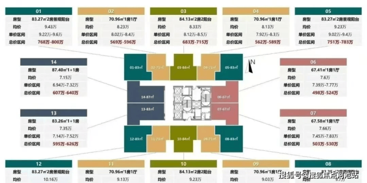 面积为67-71㎡1房卫,83-87㎡2房1卫,位于29-42F,5梯14户。