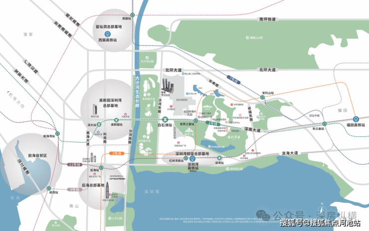 ①总部长廊·四大超级总部环绕——北有留仙洞总部基地,西有深圳湾高新区总部基地、后海总部基地,南接深圳湾超级总部基地,四大超核引擎环绕。