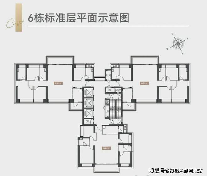 01户型142平4房2卫,02-03户型188平4房3卫,为楼王单位,层高3.15米,3梯3户。
