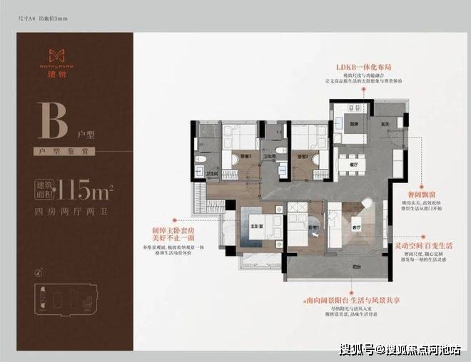 115㎡四房二卫A/B户型,大阳台,主卧通过凸窗赠送衣柜,但次卧尺度都偏小。