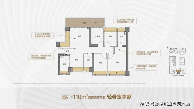 110㎡的4房2厅2卫,设计的是竖厅南北通透格局,客厅4.2米开间,进门户玄关,客厅连接次卧出6.5米长的大阳台,主卧大套间设计,全屋9处飘窗,U型厨房,卫生间干湿分离,阳台主朝北向。