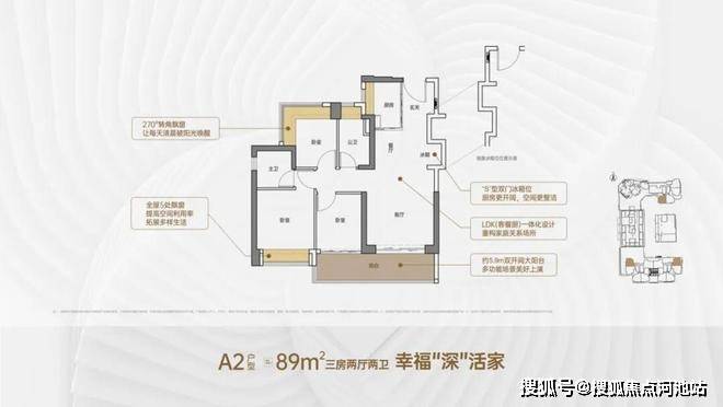 89㎡的3房2厅2卫,A2户型,设计的是竖厅格局,客厅3.5米开间,LDKB一体化,S墙设计预留冰箱卡槽位,客厅连接次卧出5.9米长的大阳台,次卧270度转角飘窗,U型厨房,卫生间干湿分离,阳台有朝西向、东向、南向。