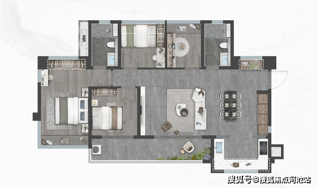 高端住宅,景更值钱。120㎡户型提供超大阳台,所有阳台南向采光,在楼宇排布中处于相对独立的板块,没有与邻居墙体相连,实现了三面采光通风,客厅、阳台和四个房间全面朝阳、通透。